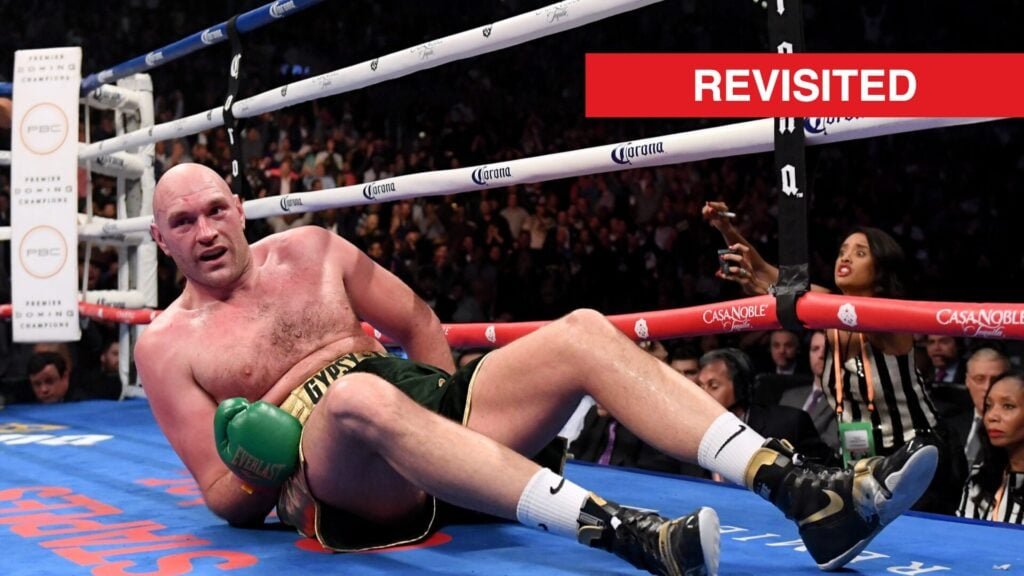 Nonetheless, what followed was probably the most iconic scenes in boxing history, as with just seconds left of the 10-count, Fury sat up and returned to his feet despite searching.