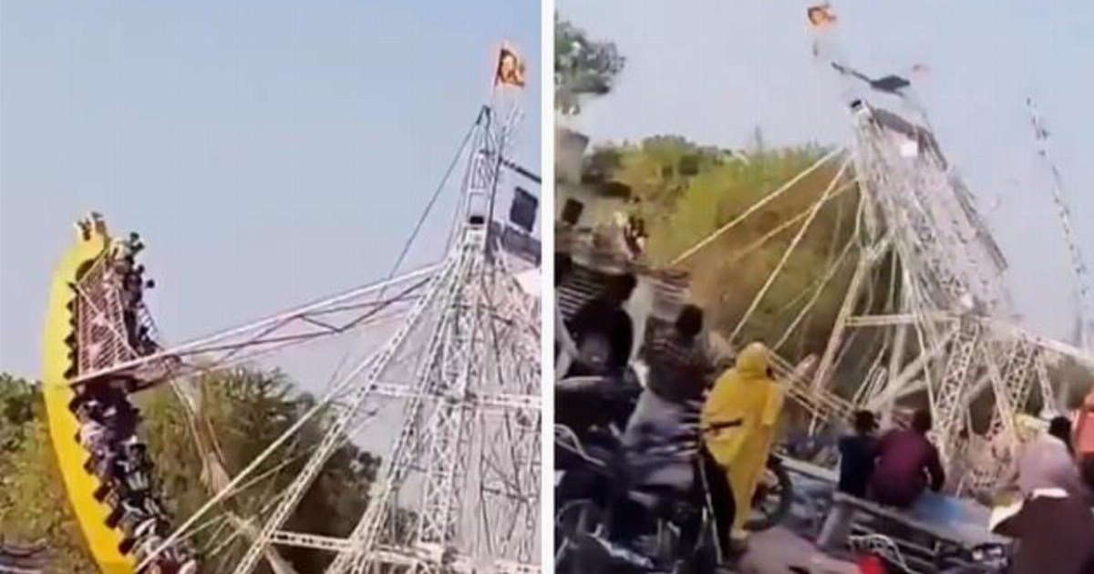 The screaming thrill seekers were thrown into the metal frame because it collapsed on top of them on the Maharaj No Melo fair in Jhabua, India.
