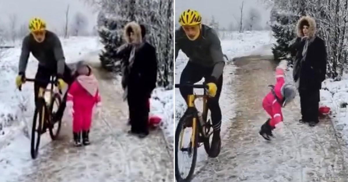 While the cyclist rides along the little girl, he appears to increase out his knee, which hits Neia within the back, sending her flying to the snowy ground.