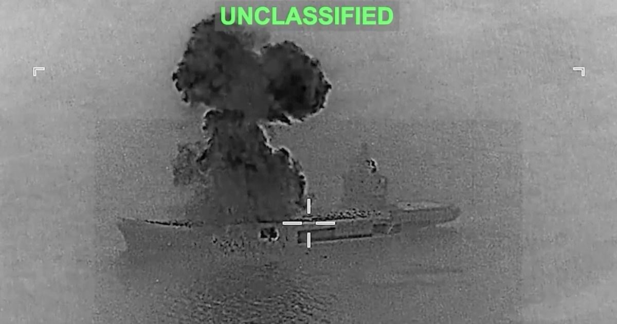 Footage shows the moment the ship which was ‘roughly the scale of a WWII aircraft carrier’ went up in smoke with debris falling into the water.