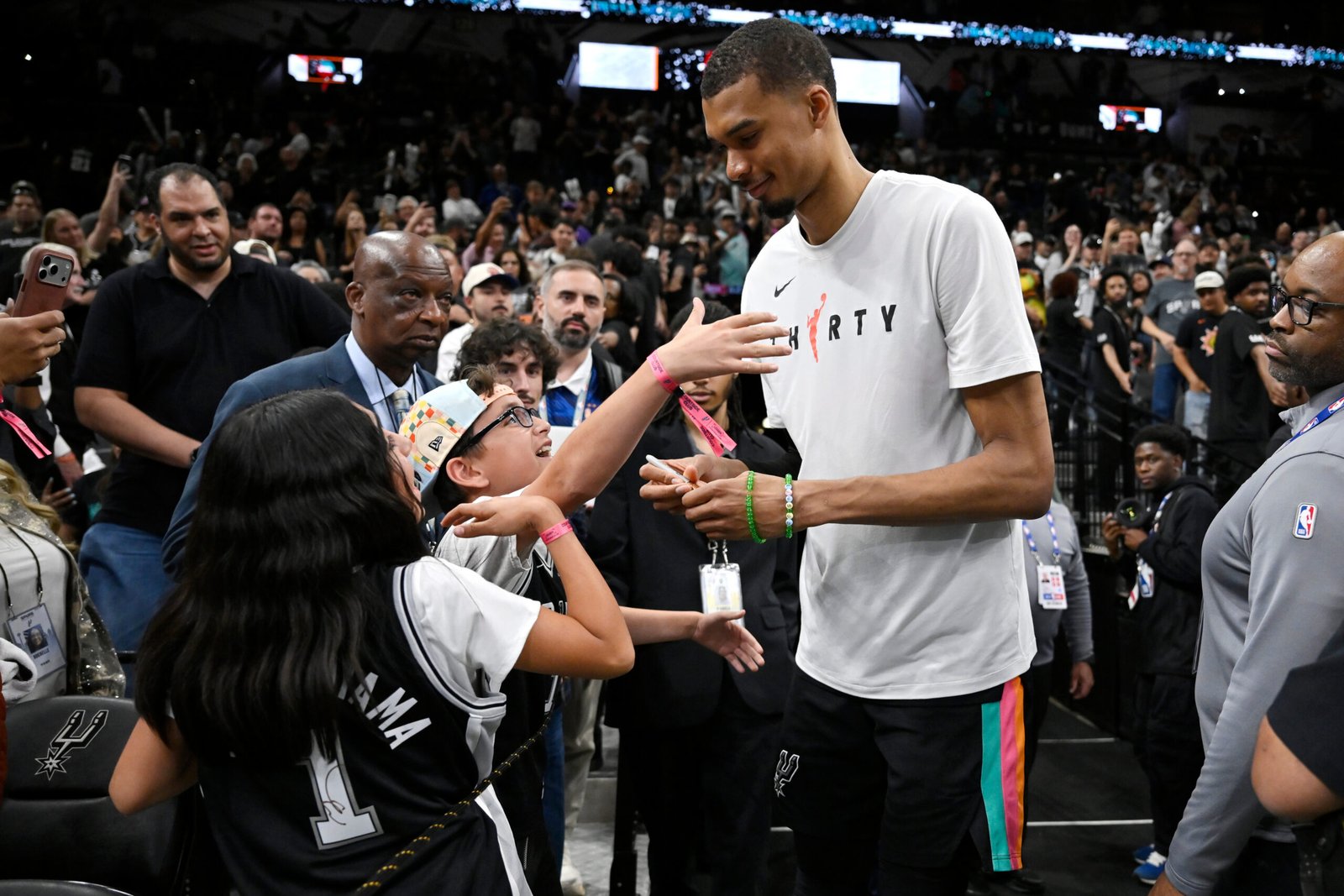 San Antonio Spurs center Victor Wembanyama, center right, greets fans after an NBA basketball game against the Dallas Mavericks, Friday, April 10, 2026, in San Antonio. (AP Photo/Darren Abate)