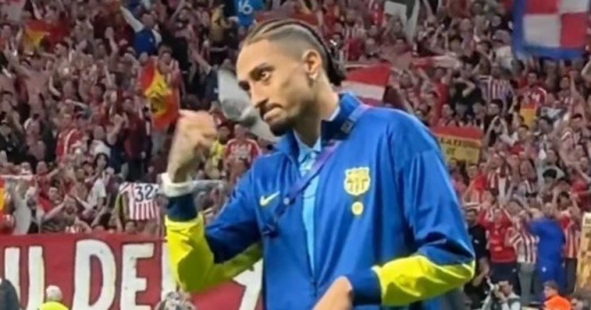 After Barcelona’s Champions League exit, Raphinha made his feelings clear towards Atletico’s supporters contained in the Metropolitano as he was caught by DAZN’s cameras saying ‘out you go’ and gesturing together with his thumb.