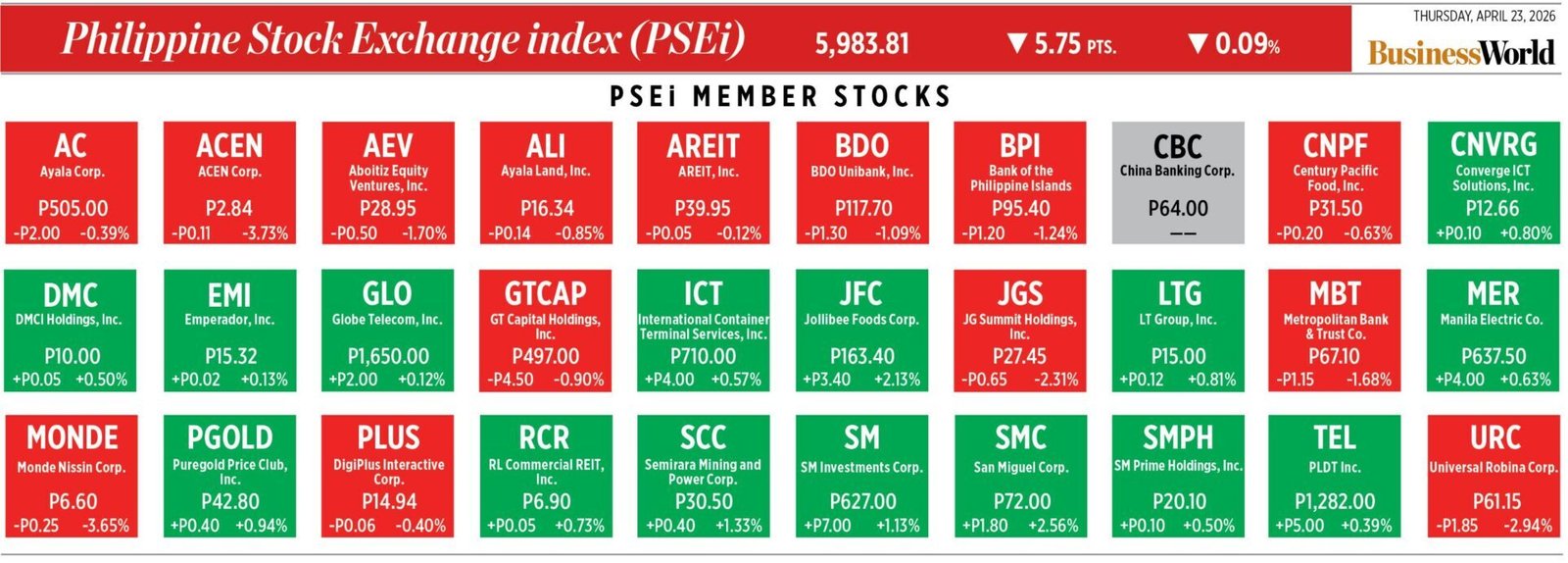 Home Corporate How PSEi member stocks performed — April 23, 2026 April 24, 2026 | 12:00 amHere’s a fast glance at how PSEi stocks fared on Thursday, April 23, 2026. Post navigation JPMorgan index may lift PHL bond demand